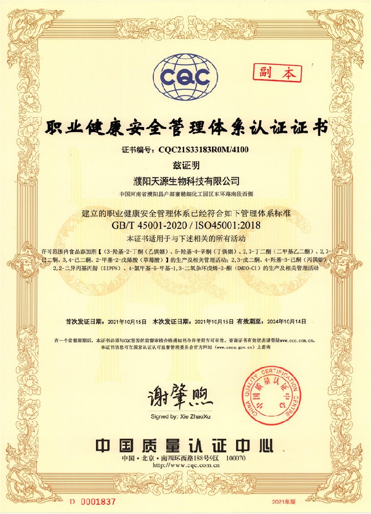 职业健康安全管理体系认证证书