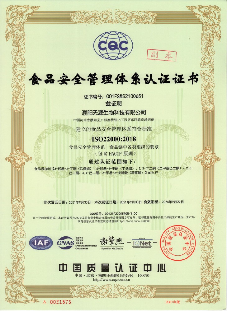 食品安全管理体系认证证书